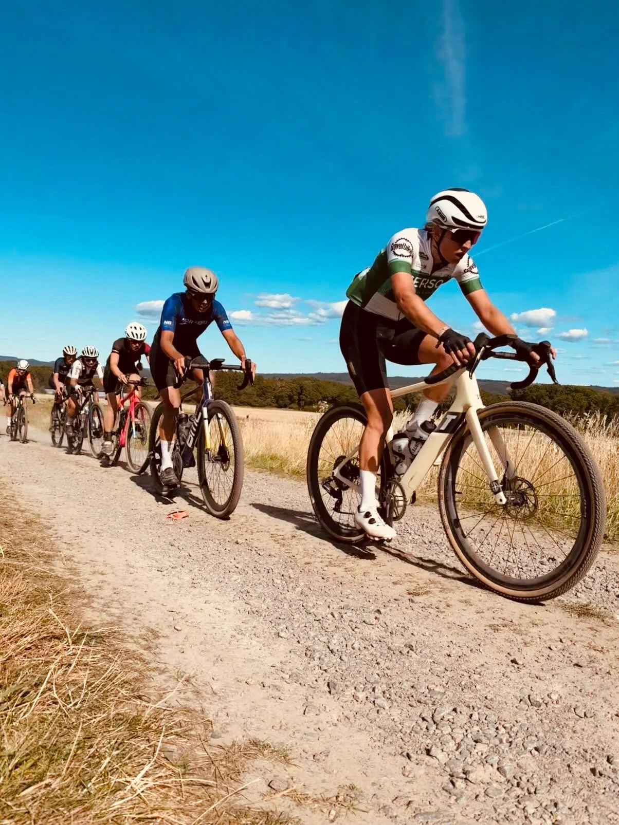 De start was pittig: een 5 km lange gravelstrook met zijwind van rechts. Het beste pad lag rechts, maar daar zat je dus ook vol in de wind. Liesl koos voor iets meer links, slim uit de wind, en hield de tegenstand in het oog. Na 500 meter kwam de eerste versnelling — ze sprong mee en plots reed ze vooraan… vol in de wind. Niet veel later doken ze de natuur in en werden ze ingehaald door een groep mannen die achter hen gestart waren. Proberen mee te springen — en yes, dat lukte! Ze zat met een grote groep, voornamelijk mannen, een paar vrouwen, en veel adrenaline. Liesl probeerde vooraan te blijven rijden, uit de buurt van mogelijke valpartijen. Terecht, want 10 km verder was er een valpartij. Gelukkig zat ze ervoor. Op de open stroken met volle tegenwind was er wat twijfel wie er ging rijden, maar na wat praten met elkaar beslisten ze om samen te werken. Toen kwam de zandbak. Chaos. Te veel volk, niemand geraakte erdoor. Afstappen dan maar en lopen — cross vibes in juni, waarom ook niet?